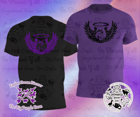 Wrap yourself in love and legacy with our Angel Horse Tribute Tee, created in memory of Nadiya and all the heavenly horses who’ve graced The Big Purple Barn. This design features a radiant winged horse with a halo, symbolizing the gentle spirits who now gallop among the stars. Whether you choose bold black or vibrant purple, each shirt carries the heart of the barn and the stories of the souls we’ll never forget.