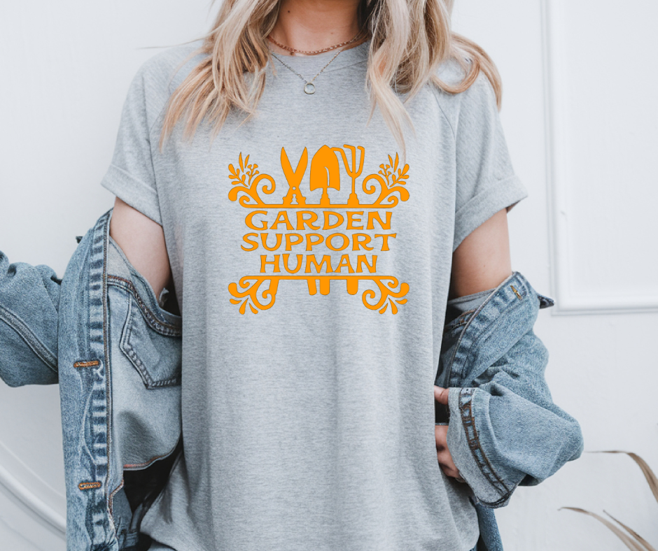 This unisex shirt is perfect for garden enthusiasts. It features a fun "Garden Support Human" design in orange, with green or orange accents. The grey shirt is a great way to express your love for gardening. A slight variation in color or pattern may occur due to its handmade nature. Colors may vary slightly from the picture.